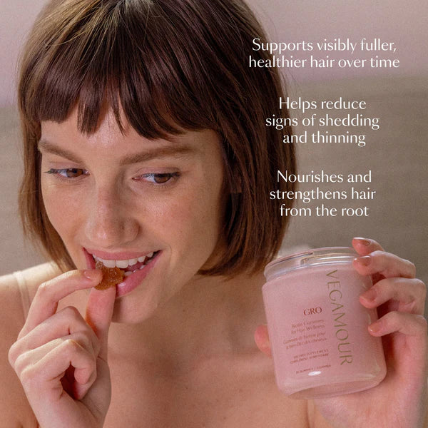 Boost your hair health with VEGAMOUR GRO Biotin Gummies. Formulated for all hair types, these tasty gummies are filled with essential vitamins and nutrients to support and nourish your hair from within.